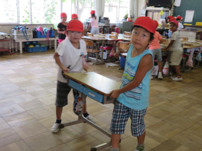 重い机も床を引きずらず、しっかり持ち上げて運びます。1年生、立派です。
