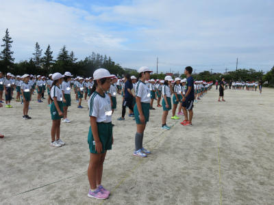 9月5日(火)朝、元気タイムの時間に「運動会全体練習」が始まりました。今朝は、「開閉会式の並び方」「体操隊形」「入場行進の並び方」を練習しました。運動会も間近に迫ってきました。