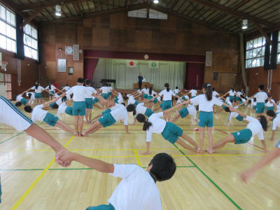 仲間を思いやる心を持って取り組もう、と先生から話がありました。指先や膝を伸ばして、美しい演技を目指しています。どうやったらうまくできるのか、積極的な話し合いも行われています。