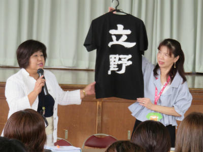 また、「立野小Tシャツ」が完成しましたので、ご報告させていただきました。運動会では6年生、ふれあいまつりでは教職員が着用し、お披露目とさせていただきます。前は立野小の食育キャラクター「たてのん」、後ろは校長が「立野」としたためさせていただきました。