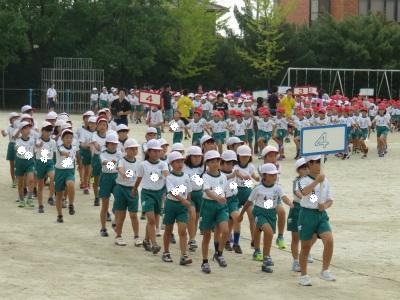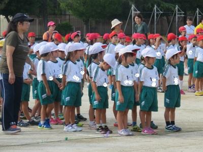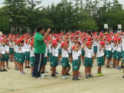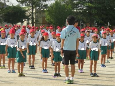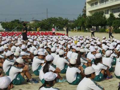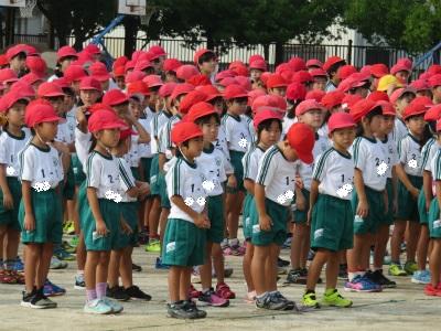 9月6日(木)朝の元気タイムで、運動会全体練習を行いました。今日は、開会式や準備運動の隊形等を練習しました。1年生も初めての運動会に向けて、頑張りを見せています