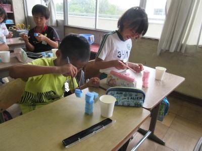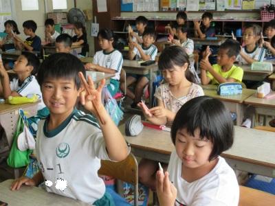 7月11日(水)2校時、3年3組において栄養教諭による「おはし名人を目指そう」の授業が行われました。スポンジに書かれた顔の表情をみながら、しっかり力が入っているかも確かめます。本校の教材は、すべて手作り。みんなで楽しくおはしの持ち方を練習しました。