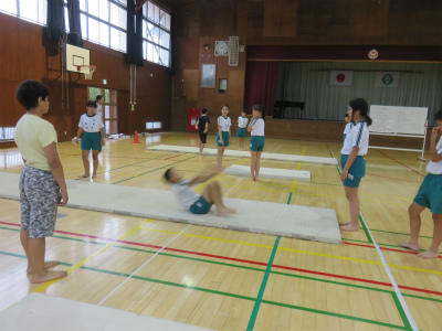 6月7日(金)5校時、体育館において教育実習生の授業がありました。今日は、6年生のマット運動です。既習事項を生かし、側転の学習につなげていました。