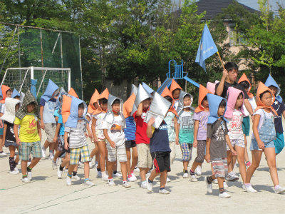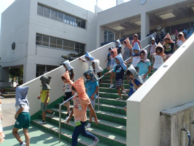 大増中学校の生徒が立野小学校に来て、合同の避難訓練を行いました。たくさんの中学生が小学生の下校班に入り、同じ地区や兄弟と一緒に帰りました。