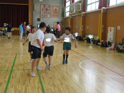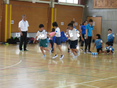 開会式に続き、ミニ運動会が行われました。4つの色別に分かれて、「フラフープリレー」「ふろしきボールリレー」「玉入れ」「サーキットゲーム」に挑戦しました。みんな元気いっぱいがんばりました。ほかの学校のお友達ともなかよくできましたね。