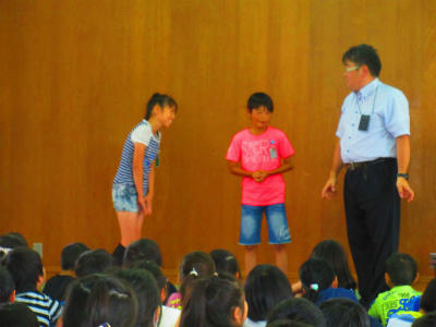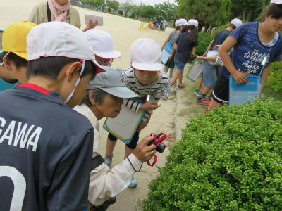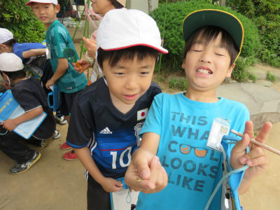 6月7日(水)埼玉県生体系保護協会春日部支部のみなさんにご来校いただきまして、4年生の「環境教育」授業が実施されました。「立野の森」に「ジャコウアゲハ」の卵を発見。大変珍しく大切に育てようとお話がありました。また、校庭に植えられた樹木には、柿、ざくろ、梅が早くも実をつけています。実ったら食べられるよ、とお話を聞き、子ども達はなんどもびっくりしていました。また、テントウムシのさなぎの抜け殻や外来種の草についても、丁寧に説明をいただき、子ども達も盛んに質問していました。生まれ育つ土地に、知識が宿り、興味が増しました。お忙しい中、ありがとうございました。