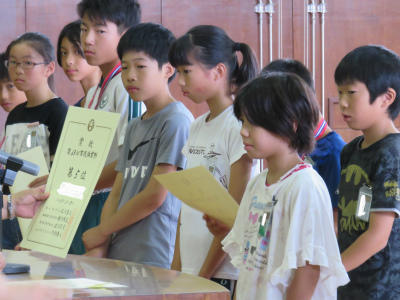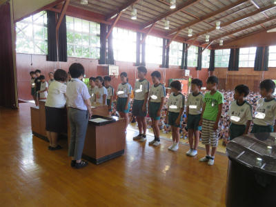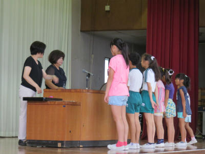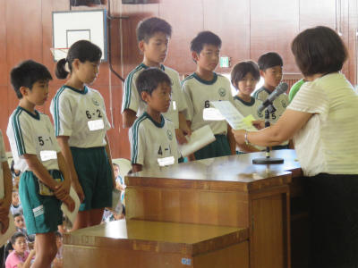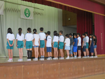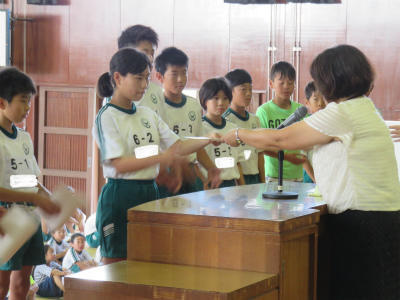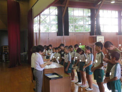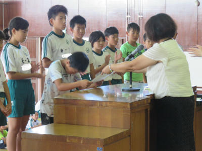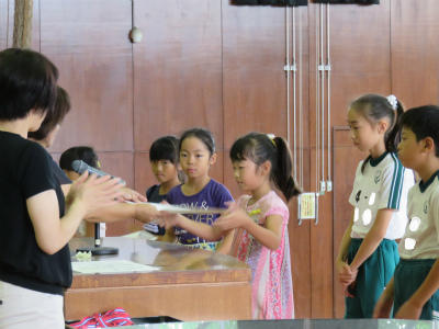 7月19日(水)表彰朝会が行われました。市内硬筆展ならびに中央展、市民体育祭、全国小学生陸上競技交流大会埼玉県予選 について賞状伝達が行われました。誇りを持って、大きな声で返事ができたことが素晴らしいですね。おめでとうございました。