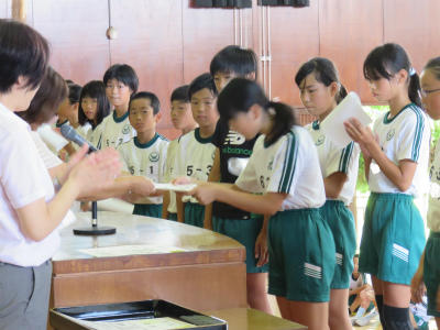 7月14日(金)表彰朝会が行われました。6月2日市内陸上競技大会で活躍した選手のみなさんの表彰を行いました。今日の給食は、5連覇記念の「カツカレー」です。よくがんばりました。