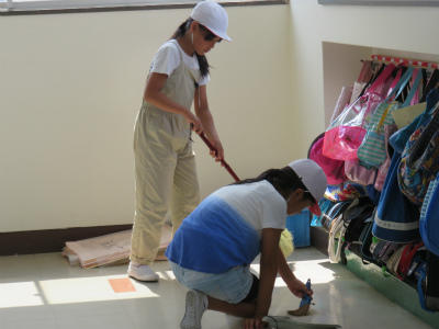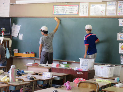 黒板は、2人がかりで上から下までピカピカです。授業も気持ちよく受けられますね。