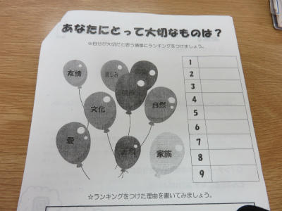 「自分」「人」彩発見プログラムから「こんなお話ないかな」「あなたにとって大切なものは?」の演習に取り組みました。熱心に自分を語り、いろいろな考えを知りました。また、後半は、「インターネットと人権~加害者にも被害者にもならないために」のDVDを視聴しました。インターネットの危険から身を守ることを考えました。