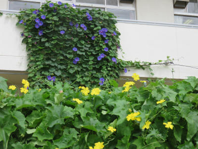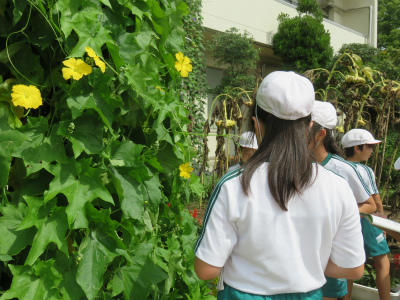 9月8日(金)4年生がへちまの観察を行いました。森田先生が、夏休み前から水やりをしながら育ててきたへちまです。大きな葉を茂らせ、花のつくのを待ちました。いまは、大きな実がたくさんなっています。雄花と雌花に興味津々です。