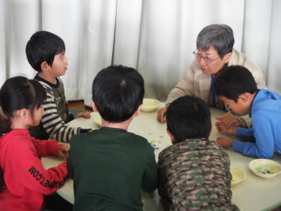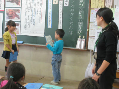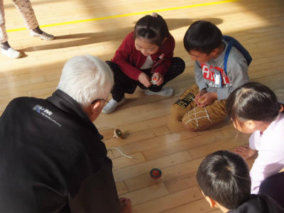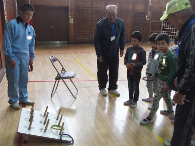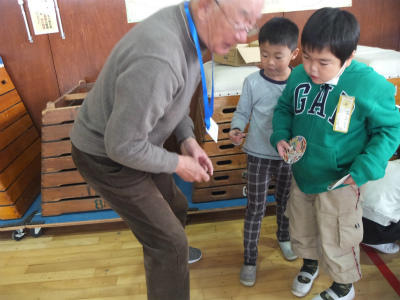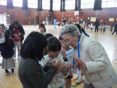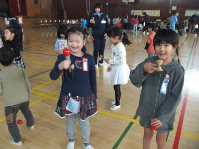 11月15日(水)9:30~体育館、にこにこルームにおいて、1年生生活科「昔の遊び大会」が開催されました。地域の皆様に御協力をいただき、ふれあいの中で昔の遊びをたくさん教えていただきました。あやとり、けん玉、おはじき、コマ回しなど、昭和の生まれの私にとっても育った街並みをも思い起こすことができたひとときでした。子ども達も満面の笑みです。御協力ありがとうございました。