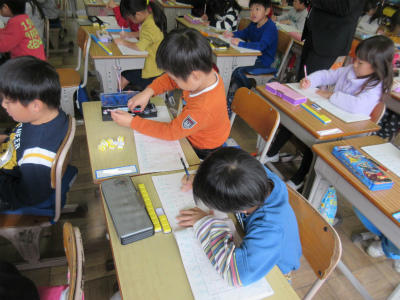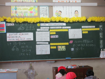 3校時は、算数「ひきざん」です。繰り下がりの加法計算を学習しました。どうやって計算するのか、たくさんの意見が出ました。