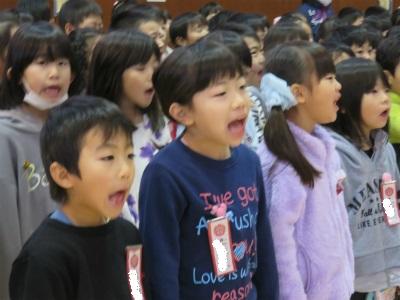 12月12日(水)朝、体育館において「音楽朝会」が行われました。元気な歌声が体育館いっぱいに響きました。1年生も元気いっぱい。この雨も上がるでしょう。