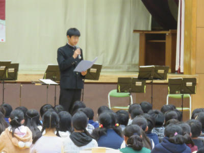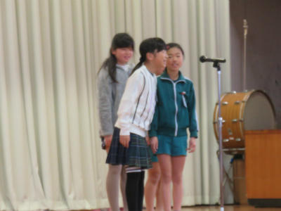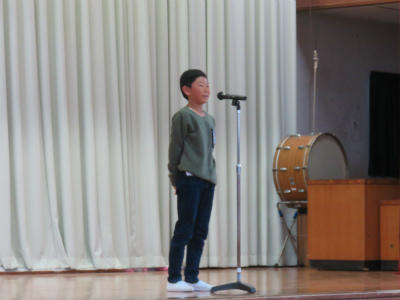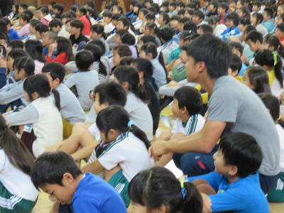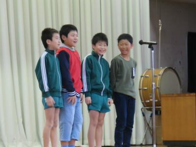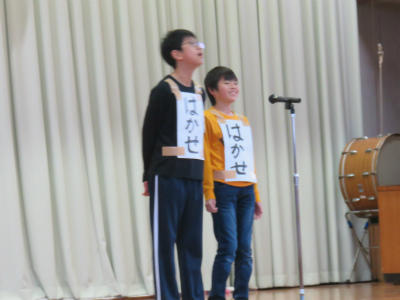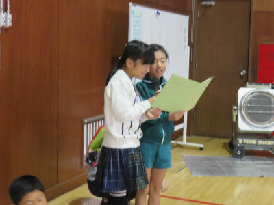 12月5日(水)朝、体育館において「児童朝会」が行われました。今日は、集会委員による早口言葉です。昇降口にも早口言葉を掲示しています。滑舌をよくして、はっきり発音することの練習にもなります。楽しい時間となりました。集会委員のみなさん、ご苦労様でした。