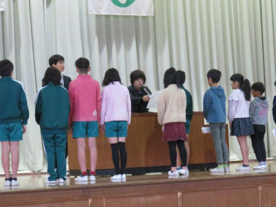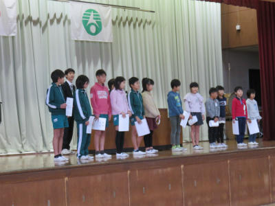 12月6日(木)朝、体育館において「元気タイム(持久走大会表彰)」が行われました。過日の持久走大会では、自分の力を出し切ることができました。今日は、各学年男女別1位の児童を表彰しました。体育主任の先生からは、全員が頑張った大会であったという話がありました。よくがんばりました。