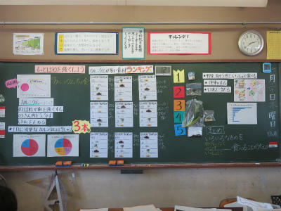 6月19日(水)4年3組において、担任と栄養教諭による食育の授業が行われました。今日は、「強い骨を作る」「カルシウム」についての授業です。丈夫な体をつくる時期です。子どもたちも楽しみながら、自分の体について学びました。
