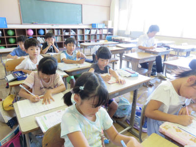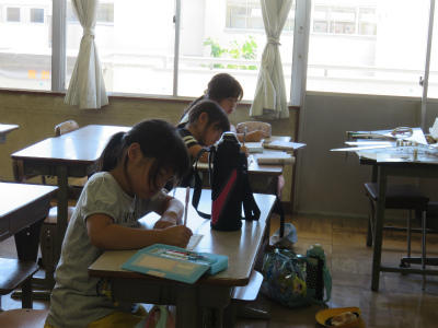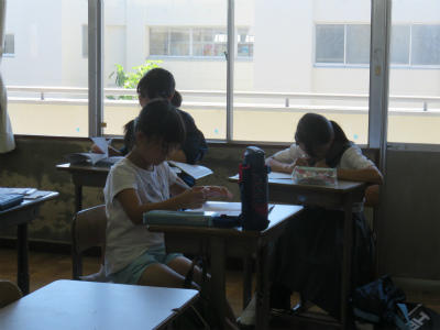 7月26日(金)9:00~、「中学生との勉強会」です。今日も3名の大増中生に御来校いただきました。お忙しい中、ありがとうございます。小学生は、慣れてくるとおしゃべりをしてしまったり、集中力が切れてしまうのかしら???せっかくの機会だから、いろいろなことを学ぼうね。