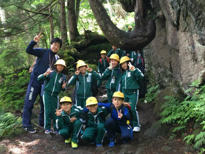 7月26日(金)11:00、ハイキングは順調です。「サルノコシカケ」というきのこと出会った(?)り、猫に見える木、ゾウさんと呼ばれる木などを見て回っています。進むにつれて岩場も多くなってきたようです。けが人もなく、体調不良者も昼食には合流できそうです。