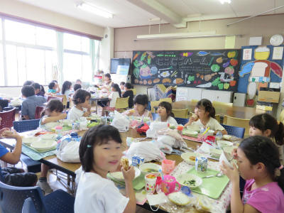 7月10日(水)昼、今日は1年3組がにこにこルームで給食を食べました。にこにこルームでは、3班に分かれて、みんなで一緒に給食を食べることができます。今日は、焼きカレーパンです。おいしそうに、そして楽しそうに給食の時間を過ごしていました。いつもの教室とはちょっとちがった雰囲気ですね。残さずしっかり食べようね。