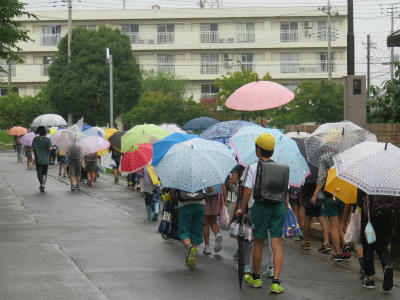 下校時は、傘の花が咲いたようです。大勢の子どもたちが一度に下校します。近隣のみなさまにもいつも声をかけていただいています。ありがとうございます。