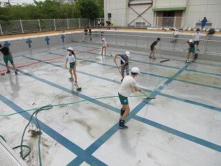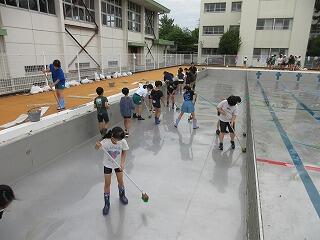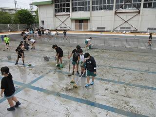 6月から始まる水泳学習に向けて、5・6年生でプールの清掃を行いました。プールの壁面や底、プールサイドにこびりついた汚れをかき集め、擦り落とし、水で流します。時折、雨がぱらつき、強い風が吹く中での作業でしたが、肌寒さをものともせず、精一杯きれいにしてくれました。
