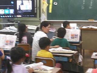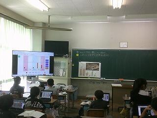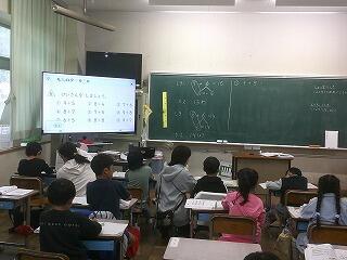 10000より大きな数の学習の導入を行いました。個人のタブレットを大型モニターと無線でつないで、児童が自席で発表をしました。児童の操作の巧みさにも驚かされました。