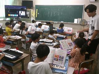 鍵盤ハーモニカの練習をしています。ペアの児童がリズムに合わせて「ド・レ・ミ」等を唱え、もう一人の児童は鍵盤ハーモニカで音階を演奏しました。ペアの効果もあり、授業中にどんどん演奏が上手になりました。