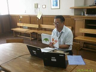 校長講話では、レオ=レオニ作「じぶんだけのいろ」の絵本を読み聞かせをし、全校道徳を行いました。また、あいさつ名人の表彰、教育実習生の終わりのあいさつを行いました。