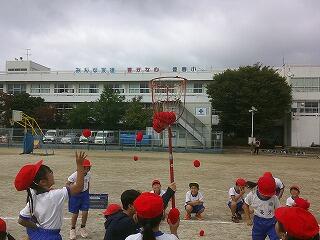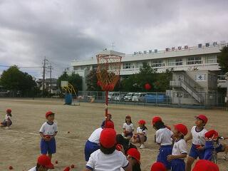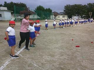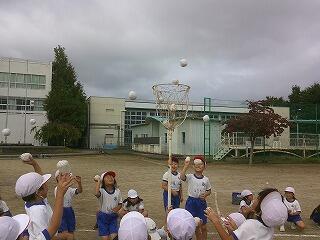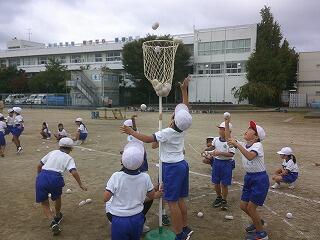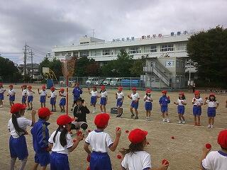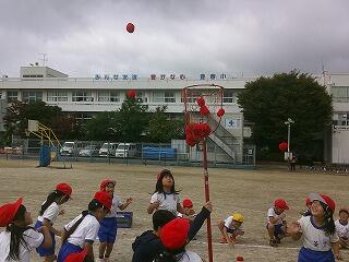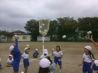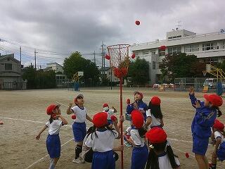 玉入れの練習です。玉入れはもちろんですが、本番は玉入れの前のダンスにもぜひ注目してください。