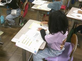 1年生の算数では、繰り上がりのある足し算を「さくらんぼ計算」で学んでいます。数を10のまとまりで考え、例えば「8+6」は6を「2+4」に分けて「8+2=10」としてから「+4」と計算します。これからも計算の力を伸ばしていきます。