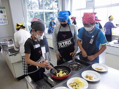 6年生が調理実習でスクランブルエッグと野菜炒めを作っていました。