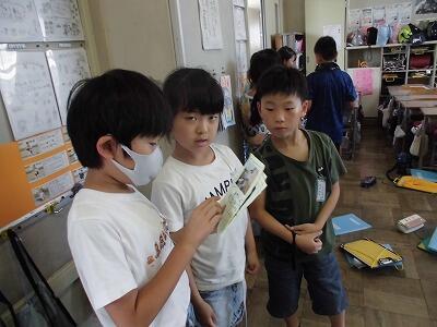 担任や補助の教員が丸を付けて回っていました。子供たちは、丸をもらってうれしそうでした。