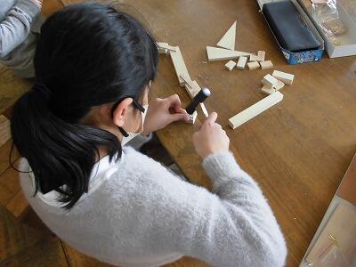 【4年生 図工】のこぎりで切った部品を釘打ちで形づくりをしています。