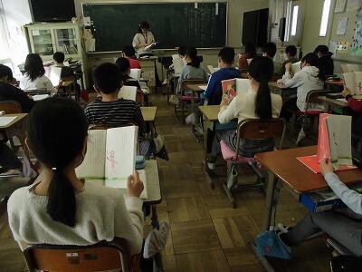 【5年生 学活】思い出の作品をバックに入れて持ち帰る準備をしています。