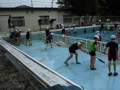 体育主任、教務副主任と校長とで、プールの排水溝のねじ締めを行いました。