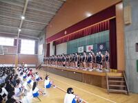 全校児童・教員が体育館に集まり、選手を激励しました。明日の陸上大会、全力を出し切ってきてください。応援しています。
