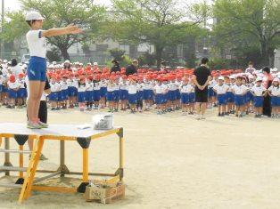 警報音が流れると校庭では素早く第1次動作ができていました。