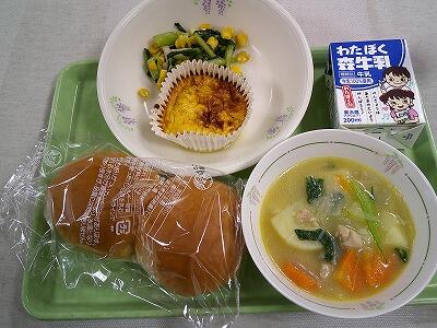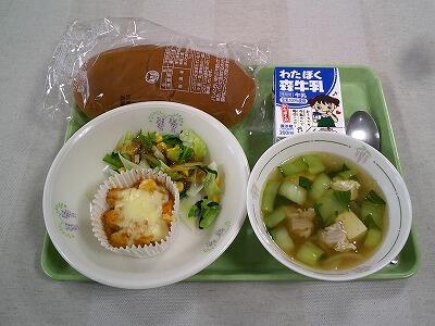 4月15日(月)おいしいジャガイモたっぷりのポテトのミートソース焼きと出汁の効いたチンゲンサイのスープ
