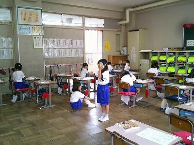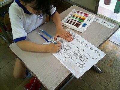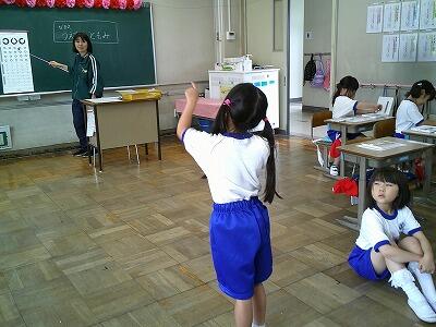 1年生の視力検査の様子です。視力検査の図で穴の開いている方向を体をよじらせながら指で指している様子が、なんとも1年生らしいです。待っている子ども達も色塗りをして静かに待てていました。