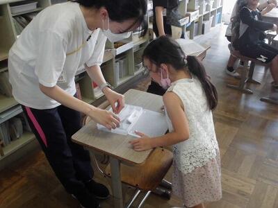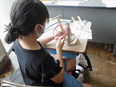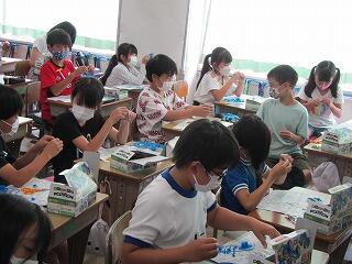 【4年生 図工】紙のテープを編んでかごや帽子をつくっています。
