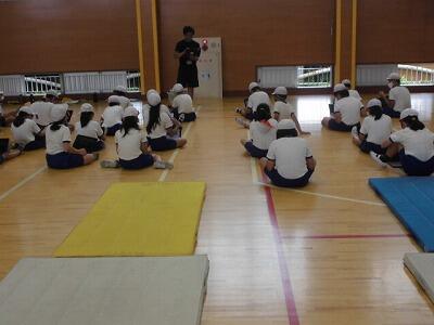 【4年生 体育】後転を習得しやすいように場の工夫をしています。また、熱中症防止対策で、スポットクーラーを設