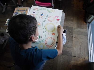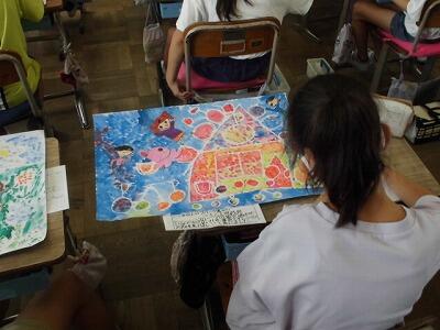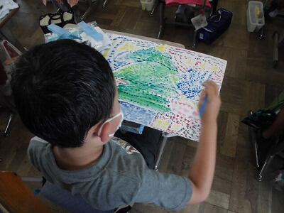 【3年生 図工】クレヨンで描いた模様をはじかせながら色をつけています。