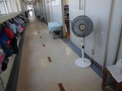 【熱中症対策】教室では、エアコンと扇風機を併用しています。廊下にも扇風機を設置しています。