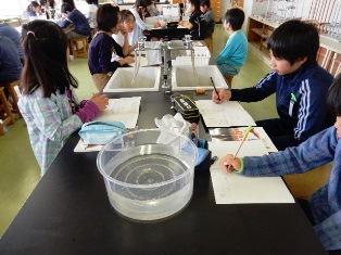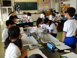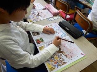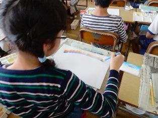 5年生は図工の授業で、水彩絵の具を使って画用紙に彩色