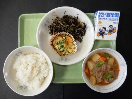 ごはん、キャベツの卵焼き、ひじきの五色炒め、新じゃがのそぼろ煮、牛乳です。