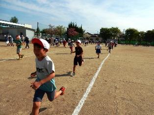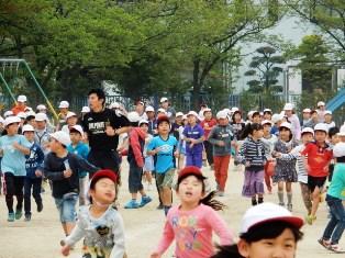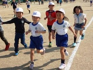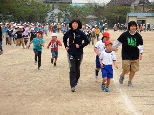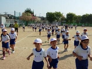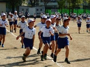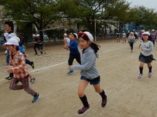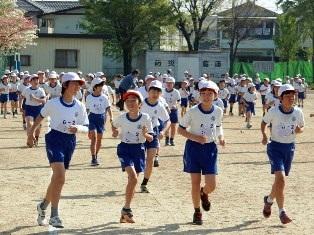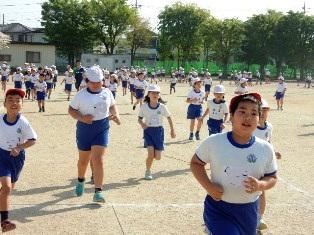 音楽に合わせて校庭を走る子どもたちです。皆さん、頑張って