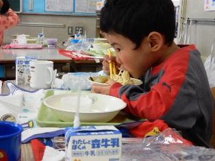 初めての麺類ですが、今日もにこやかに食べている1年生です。