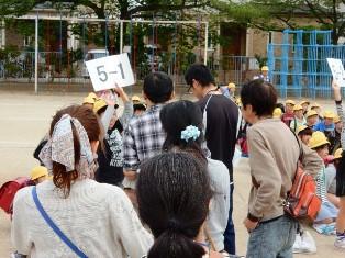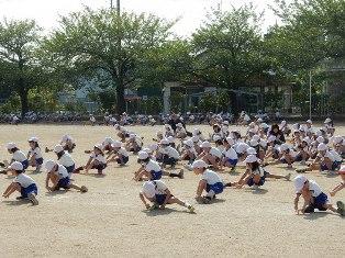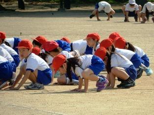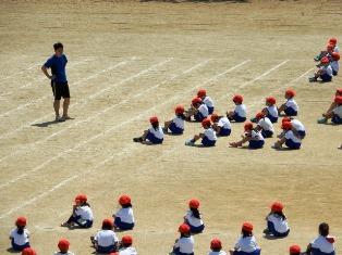 次の時間は、1年生全員が校庭に出て、体育の授業です。