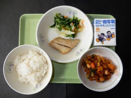ごはん、さわらの西京焼き、春キャベツのおひたし、とり肉と野菜のうま煮、牛乳です。